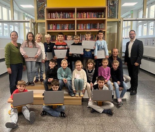 Filialleiter Simon Warwaris von der Sparkasse St. Florian überreichte uns 20 hochwertige Laptops zur Verwendung in den Schulklassen. Nicht nur die ersten Grundlagen in digitaler Bildung sind Lerninhalt der Volksschuljahre. Die PCs finden auch Verwendung im Unterrichtsalltag. So werden sie auch regelmäßig für Lern- und Leseprogramme, für projektorientierten Unterricht und bei Gruppenarbeiten verwendet.